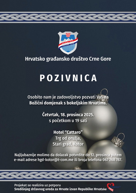 Hrvatsko građansko društvo Crne Gore poziva članove i goste na Božićni domjenak u četvrtak 18. prosinca 2025. s početkom u 19 sati u Hotel “Cattaro” Stari grad Kotor.