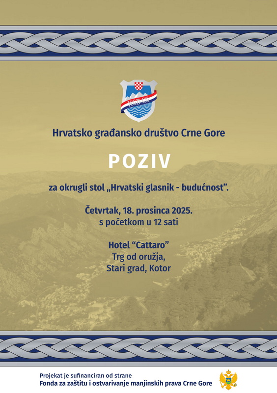 Hrvatsko građansko društvo Crne Gore poziva sve zainteresovane na okrugli sto povodom 200 jubilarnog broja Hrvatskog glasnika – “Hrvatski glanik – budućnost” u četvrtak 18. prosinca 2025. s početkom u 12 sati u Hotel “Cattaro” Stari grad Kotor.